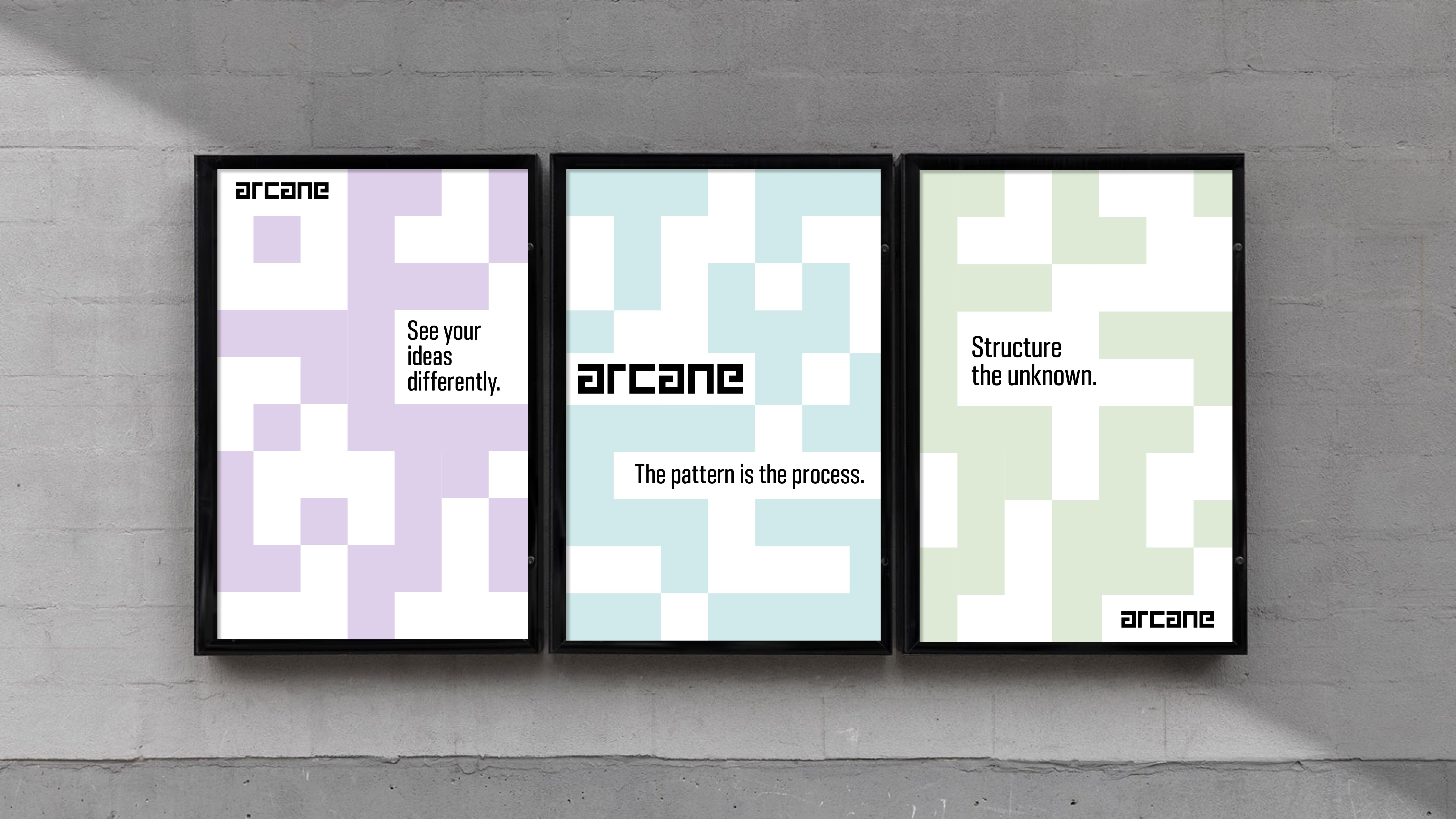 The design process began by studying the early moments of ideation, the sketches, fragments, and connections that often go unnoticed. These raw materials became the foundation for Arcane’s identity. We explored geometric forms, shifting grids, and subtle spirals to capture the tension between intuition and structure. This phase was less about style and more about understanding the deeper logic that guides creative thinking.